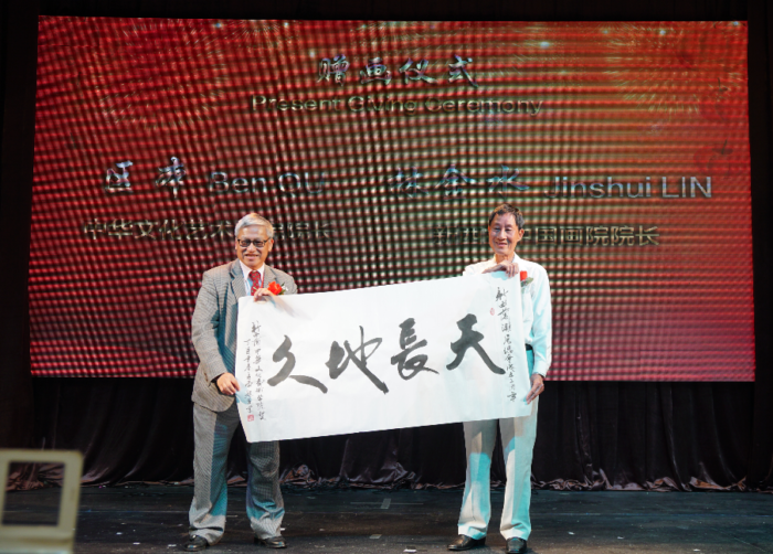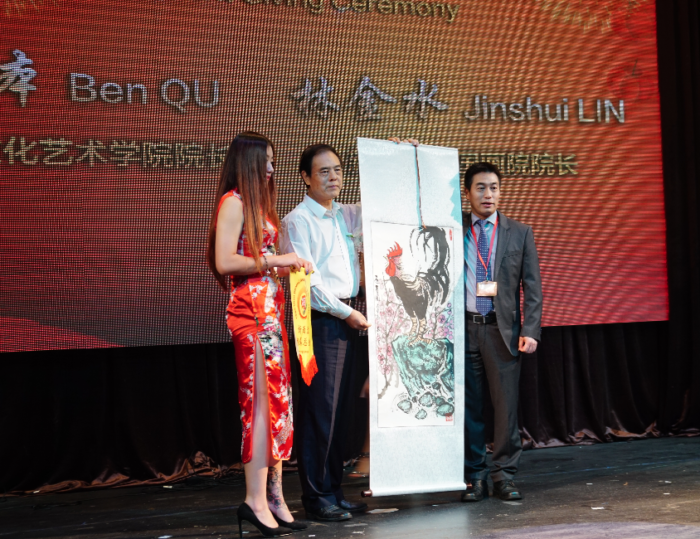 接著﹐执行会长王觉杰及姚子扬上台接受新西蘭中國畫院院長林金水的「金雞報曉」及区本書畫家的「天長地久」賀詞﹔數百與會者與本市各媒體記者欣然見證了兩位畫家對本會的美好祝愿﹗