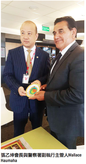 訪問團首先抵達新西蘭警察署總部。在奧 克蘭亞裔聯絡官Jessica Phuang及國家少數民族戰略顧問Elizabeth Young 的安排下,會見了分 管毛利、島民及各少數族裔社區的警察署副執 行主管人Wallace Haumaha。Wallace對潮屬總會 為增進警民合作所做的努力表達感謝。張乙坤 會長則明確潮屬總會在未來不僅將繼續執行與 警方合作的新年年曆項目,還會支持由Jessica 牽頭的留學生服務項目的開展。張會長表示,希 望潮屬總會繼續做好力所能及的工作,警民合 作,為建設新西蘭更加安全的社區努力,因為社 區的安全是潮屬總會成功申辦20屆國際潮團會 議的保障。會面之後,張會長一行還參觀了新西 蘭皇家警察學校。