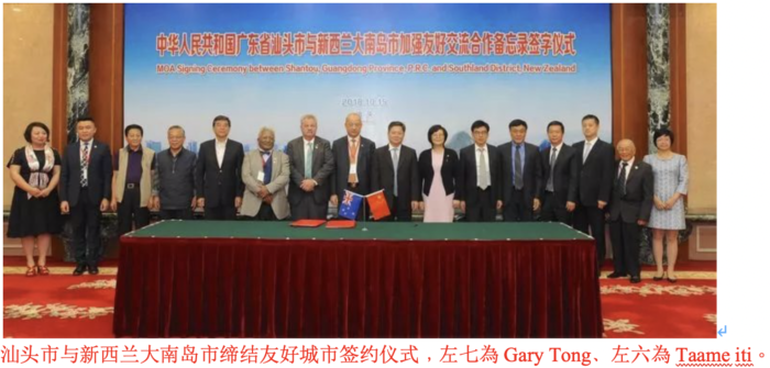 10月15日,新西兰大南岛市与汕头市签署了加强友好交流合作备忘录 (Memorandum between the city of Shantou, Guangdong Province, The People’s Republic of China and Southland District, New Zealand on Promoting Friendly Exchanges and Promotion),加理·唐表示﹕汕头与大南岛市经济发展互补性强,在海洋渔业、农林畜牧业等领域合作空间广阔﹔他還期待两个缔结友好的城市市民,代代相傳﹑友好下去。