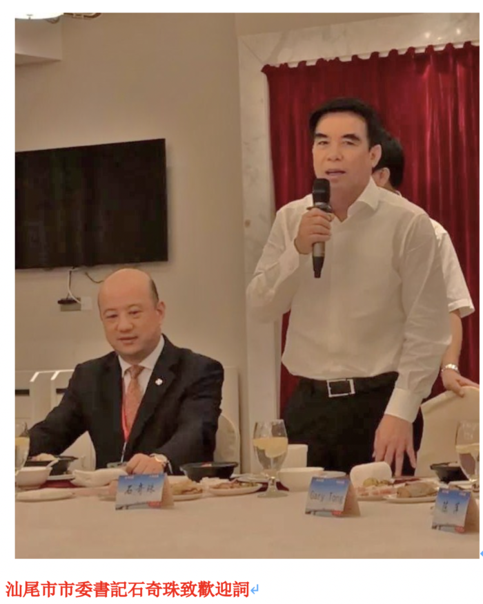 汕尾市市委書記石奇珠深情回忆他去年新西兰的友谊之旅﹐熱烈欢迎乙坤主席一行到访候﹐不忘感谢新西兰潮籍乡亲去年的盛情款待﹔更感谢張主席代表国际潮团总会邀请汕尾市有关组织加入到潮团大家庭中。