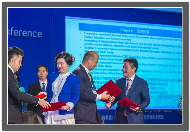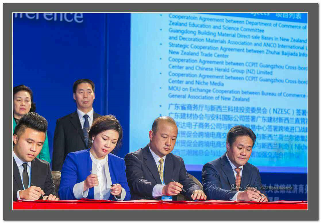 新西兰潮属总会会长张乙坤先生和汕头市商务局局长邓夏思先生于5月29日在奥克兰Langham酒店举行的中国(广东)-新西兰经贸合作交流会上,签署了“关于加强经贸交流与合作备忘录”; 同时潮属总会副会长郑时佳先生代表安科国际有限公司 (ANCO International Ltd) 和广东省建筑装饰材料行业协会也签署了“广东建材(新西兰)直营基地合作框架协议”。