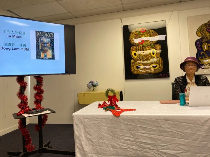 新西兰潮属总会林爽秘书长自上世纪90年代移民至新西兰,不久即对本地毛利文化产生浓厚兴趣,并一直学习研究,有《紐西蘭的原住民》、《云乡龙裔毛利情》等介绍毛利风土人情的著作,是新西兰华人探索及推广毛利文化的先驱者。为支持林爽秘书长,让更多人关注和了解毛利文化,本会应奥克兰国际艺术空间宗元主席邀请,与奥克兰国际艺术空间共同主办林爽秘书长主讲的毛利文化系列讲座。本期讲座主题为“从新西兰外长的纹身谈:”毛利纹身的理事与现实意义“。本会名誉会长林介山先生、会长陈植太平绅士、会董赵今先生等会员出席本次讲座。感谢赵今先生现场拍摄供图。
