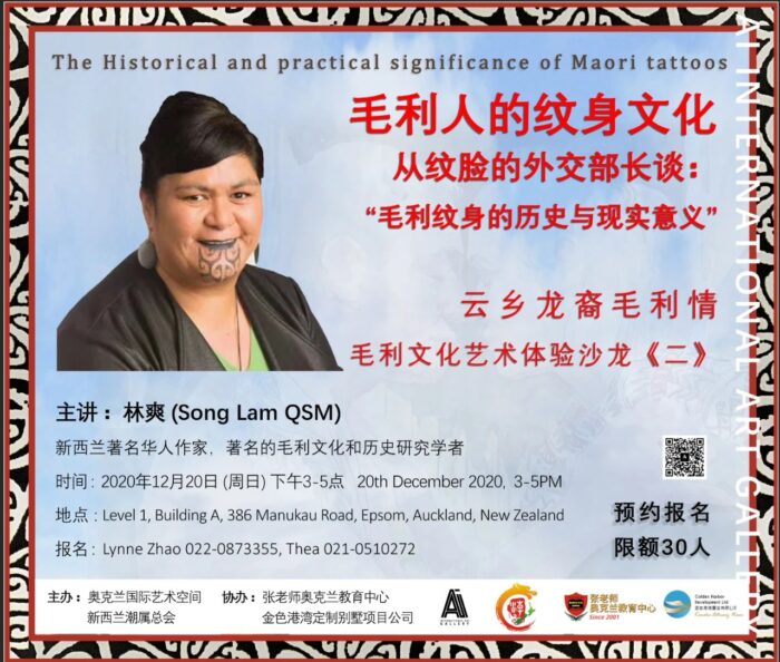 发布时间: 2020 December 22 责任编辑: CSGA 人气: 50新西兰潮属总会林爽秘书长自上世纪90年代移民至新西兰,不久即对本地毛利文化产生浓厚兴趣,并一直学习研究,有《紐西蘭的原住民》、《云乡龙裔毛利情》等介绍毛利风土人情的著作,是新西兰华人探索及推广毛利文化的先驱者。为支持林爽秘书长,让更多人关注和了解毛利文化,本会应奥克兰国际艺术空间宗元主席邀请,与奥克兰国际艺术空间共同主办林爽秘书长主讲的毛利文化系列讲座。本期讲座主题为“从新西兰外长的纹身谈:”毛利纹身的理事与现实意义“。本会名誉会长林介山先生、会长陈植太平绅士、会董赵今先生等会员出席本次讲座。感谢赵今先生现场拍摄供图。