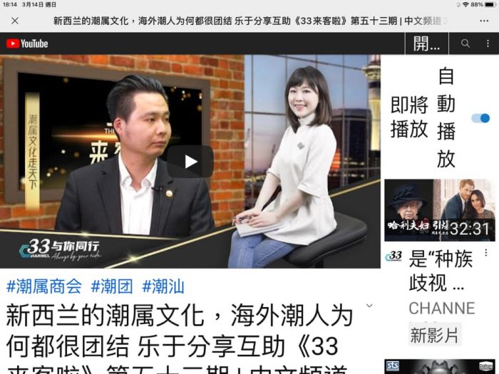 新西蘭潮屬總會新會長陳植接受新西蘭TV33專訪,暢聊潮屬文化走天下 – 新西蘭的潮屬文化。 視頻連接: https://www.youtube.com/watch?v=pNu1VbLogkk