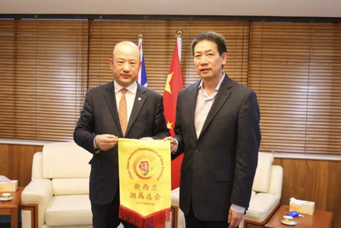 2019年6月20日,国际潮团总会主席、新西兰潮属总会董事局主席张乙坤先生率团拜访中国驻奥克兰总领事馆,受阮平总领事接见﹔张宇领事也参与接见活动。