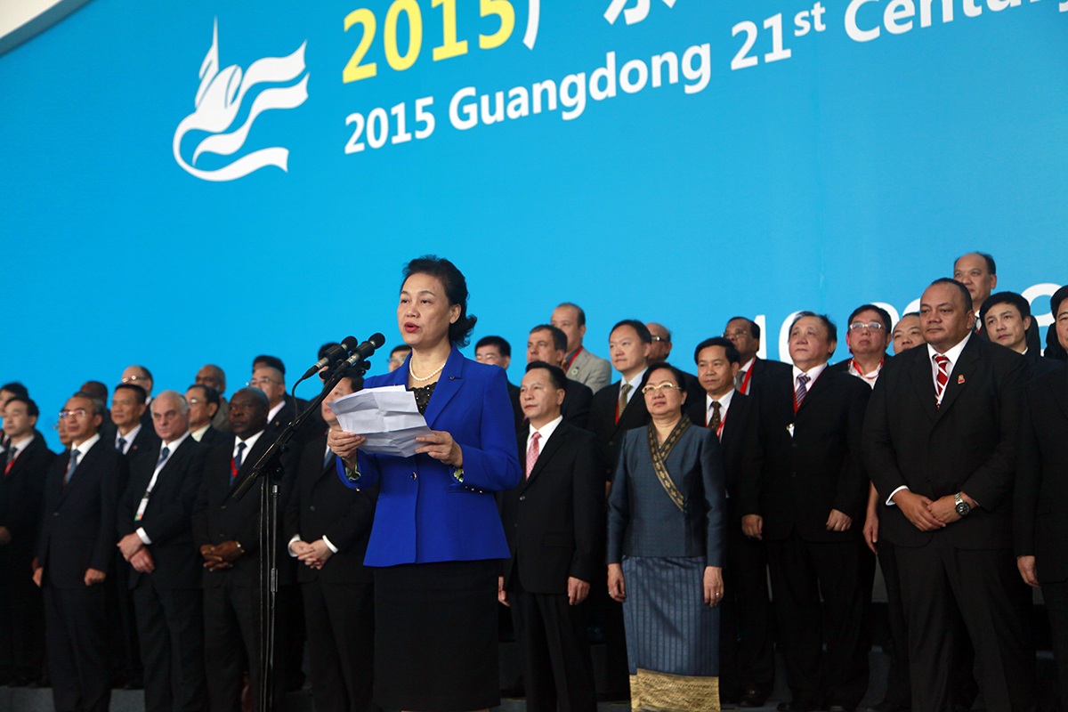 汤加副首相肖西·索瓦莱尼,老挝工业贸易部部长开玛尼·奔舍那,泰国前副总理泰中友好协会会长功·塔帕朗西,广东省副省长招玉芳,世界城市和地方联合政府组织亚太区秘书长博纳蒂娅等领导出席开幕式。广东省副省长招玉芳、东莞市委书记徐建华分别致辞。