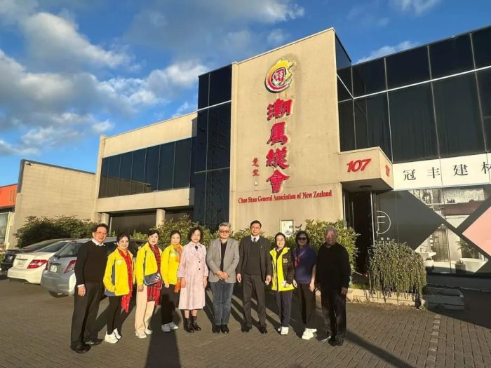 新西兰潮属总会执行会长兼商会会长王锡钢、名誉会长林介山伉俪、本月值班会长陈莉、常务副会长林郁明、副会长潘启腾、赵健淋、理事长张俊强等理监事会骨干热情接待合唱团一行。合唱团团长林若微和团员们现场合唱家乡方言歌谣,潮属百灵鸟陈莉会长即兴以歌会友,现场高歌一曲毛利歌。