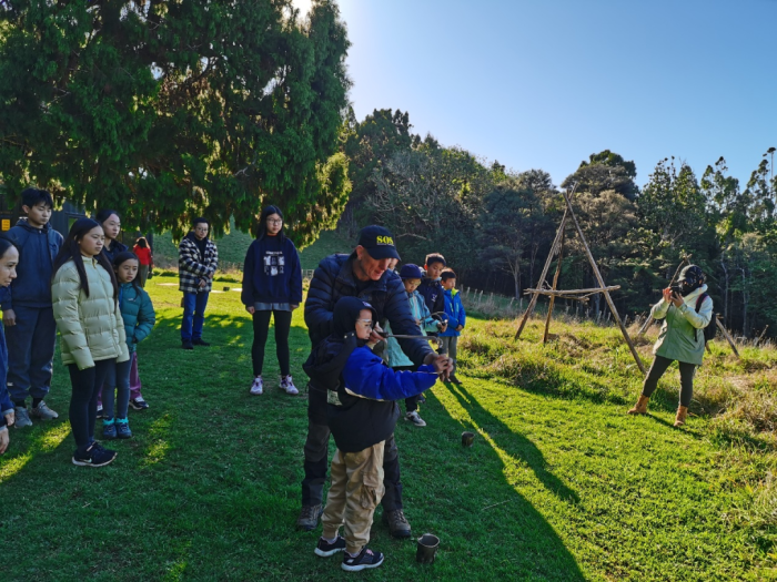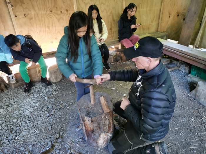 在短暂的早茶休息时间后,大家跟随教练进入丛林,来到了户外教室第二站。教练详细介绍了个人求生工具包 (Personal Survival Kit) 里的各种工具及其使用方法。小学员们专心聆听并动手实践如何使用小镜子反射阳光求救,如何用短刀和木头做成的锤子 (bush hammer) 配合劈开木头,以及如何正确卷绕收纳绳子。他们还学习了使用钢丝锯 (wire saw) 两两一队像拔河一样锯木头,甚至学会了在没有工具时如何劈断部分木材。教练强调,这些实际技能和经验是书本和电视无法替代的。孩子们在每个实践环节都表现出了极高的热情和专注。