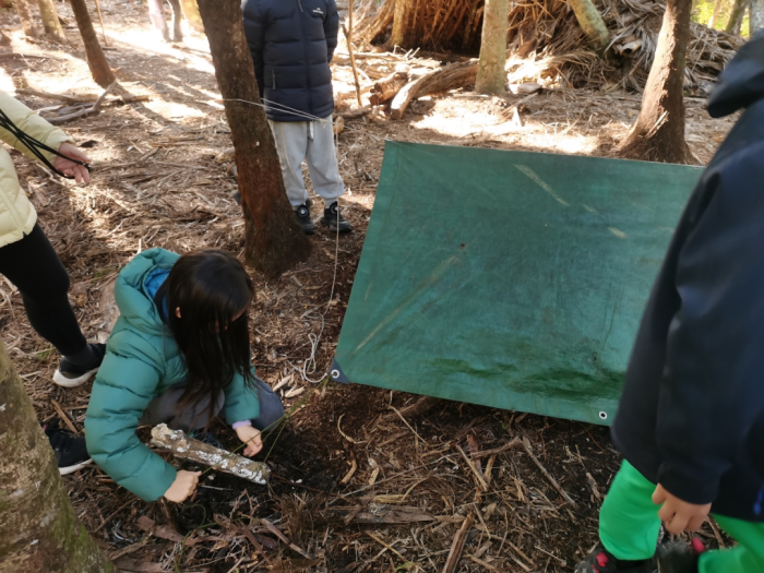 午饭后,大家在教练的带领下继续远征,来到丛林深处第三站,学习如何搭建野外生存的临时庇护所。教练首先演示了选址、收集材料、搭建框架和覆盖材料的步骤,然后将孩子们分成三组,在时间限制内各自建造庇护所。队员们通力合作,在选定好地点后迅速找齐材料,将野外庇护所的框架迅速搭建起来。接下来是分头寻找不同材料,尽可能覆盖庇护所,再找些其他细小材料来修补,确保庇护所能通过教练最后的泼水测试。随着结束时间的临近,虽然大家不说话,但手脚明显更加快了,家长们也纷纷动手帮忙。最终,所有队伍都通过了测试,大家的喜悦之情溢于言表。