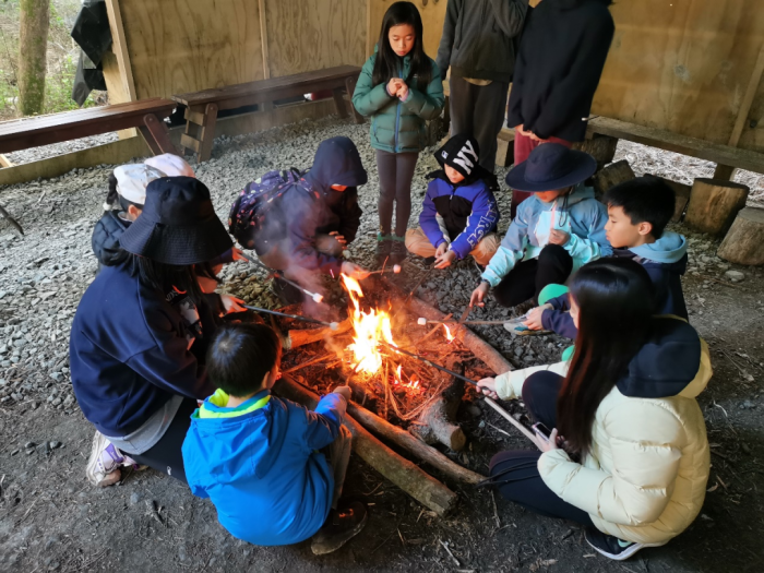 在第三站,大家还学习了如何收集使用野外材料将一块帆布挂起来并固定作为庇护所使用,以及如何利用阳光和树枝的影子找到北方。之后,大家凭借所学知识找到了回到第二站的路。在那里,教练再次教授了小学员们如何生火以及制作火堆。最后,教练还教给了孩子们如何在火堆旁烤棉花糖。这无疑是当天最受欢迎的活动,小学员们非常积极地一个接一个地进行了练习,甚至根本不需要教练提醒,自动自觉地又烤起了第二轮、第三轮……第N轮棉花糖。边烤边赞叹自己烤的棉花糖真好吃!